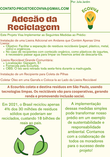 Sabemos que infraestrutura sem informação não gera mudança. Por isso, desenvolvemos materiais educativos, como panfletos e cartazes ilustrativos, que explicam como separar corretamente os resíduos, o que pode ou não ser reciclado, e os impactos ambientais de pequenas ações do dia a dia. Essa iniciativa visa transformar hábitos a partir da conscientização, tornando o ato de reciclar simples, acessível e integrado à rotina dos moradores